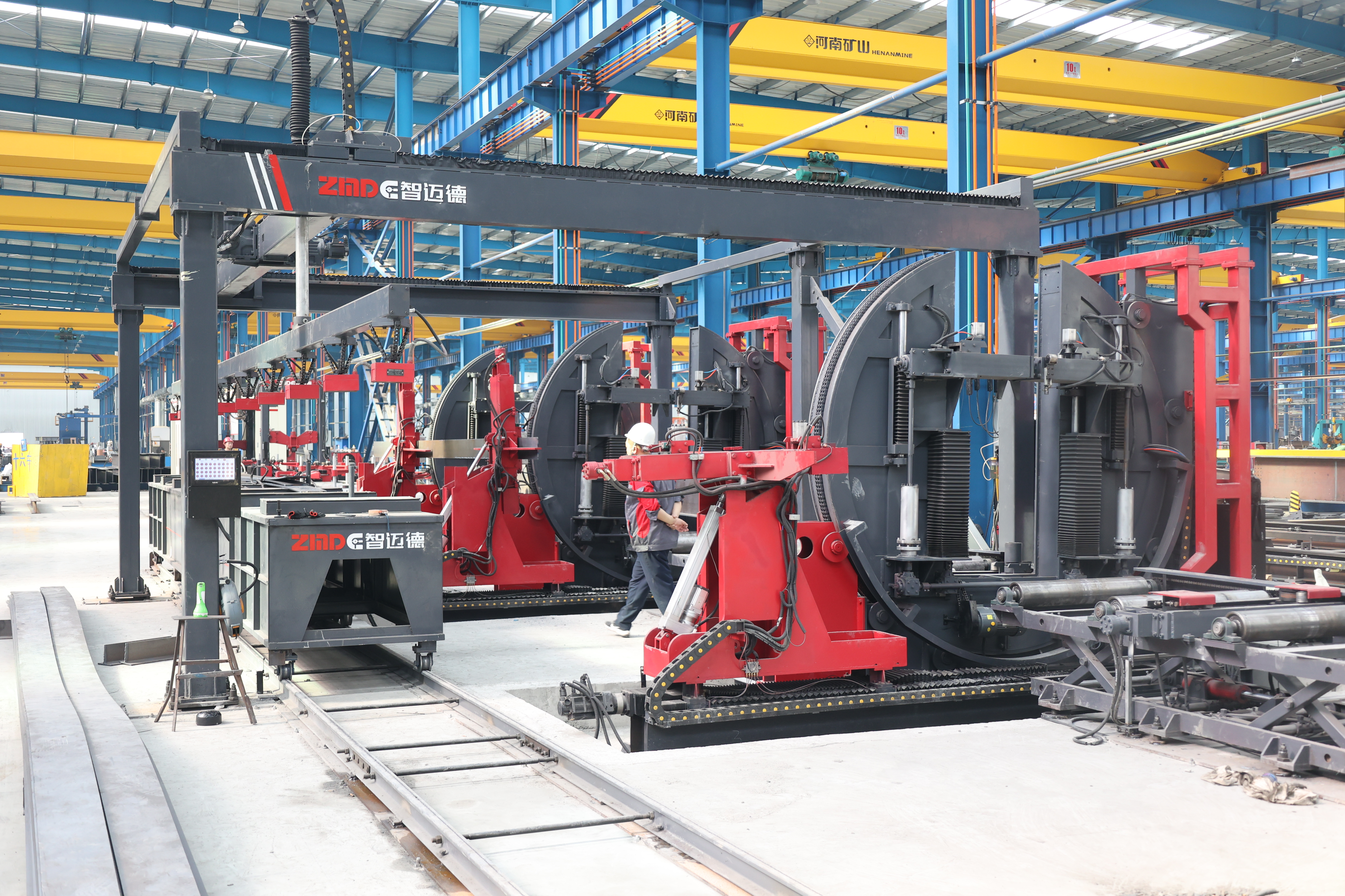 這套包含33項專利的裝配式建筑鋼梁全自動化生產線,來自位于濰坊濰城區的智邁德股份有限公司。智邁德成立于2013年,創業以前,董事長張兆瑞曾在鋼構廠的多個崗位工作過,他發現鋼構件加工作業存在痛點:至少需要組立機、龍門焊、矯正機三臺設備依次完成組立成型、焊接、矯正三道工序,設備之間的轉運必須通過車間內的行車反復多次吊裝。