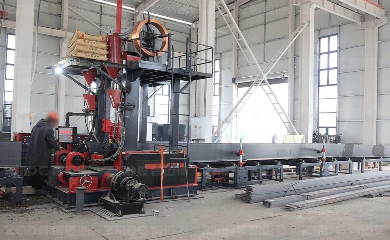 組焊矯一體機深度融合組立、焊接、矯正三道工序,實現了鋼結構生產流程的重構。設備通過精密、集成的設計和智能化控制系統,能夠實現整個過程的自動化、智能化生產,僅需1~2人即可完成操作,可自動對中,無需點焊,腹板18mm以下免坡口焊接,采用熱焊熱矯工藝,從頭焊到尾,提高了生產效率,提升了鋼構件的加工精度和品質。與此同時,可選配智邁德“絕影”三極三弧焊機,大幅提升焊接效率,或選配智邁德“烏騅”六極六弧焊機的組焊矯一體機,實現厚板的焊接。
